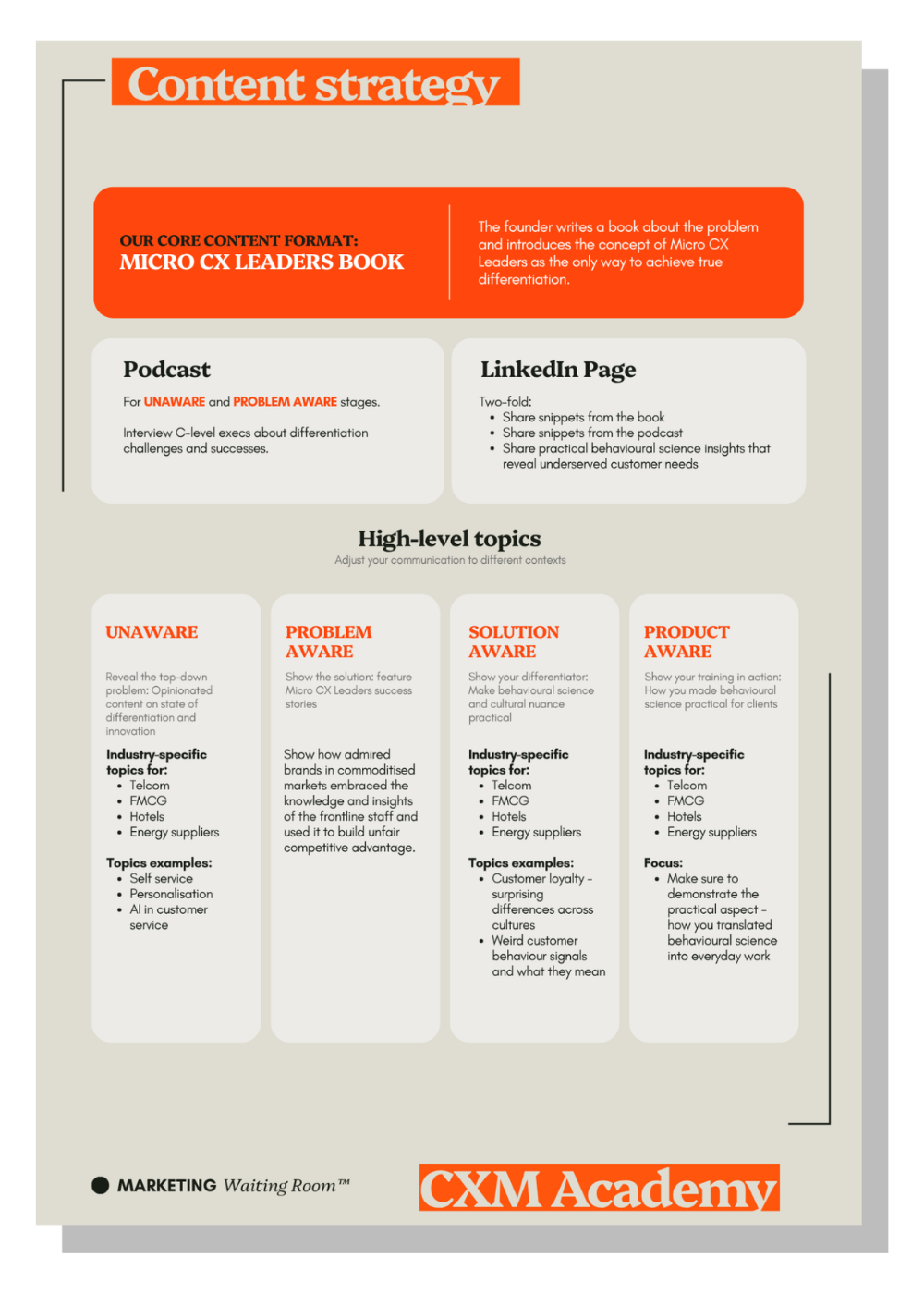 I translate your claim-to-fame into a practical content strategy that helps you spread the word. It breaks down how to adapt the message for different personas, stages of awareness, channels, and formats. This becomes your team's single source of truth.